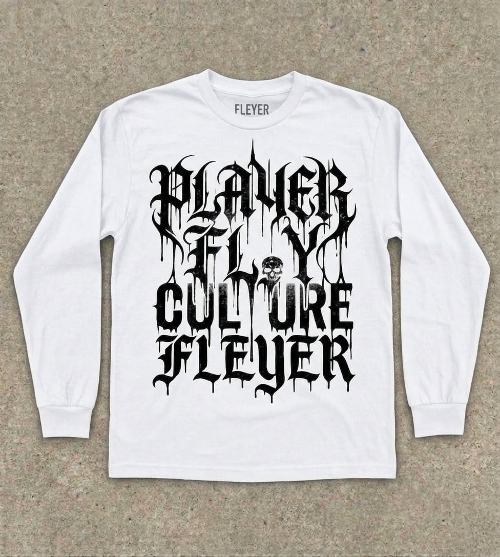 「PLAYER」「FLY」「CULTURE」そしてブランドの核となる「FLEYER」のタイポグラフィが、複雑に重なり合いながらも力強いメッセージを放ちます。